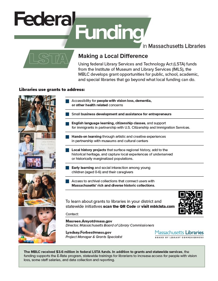 To learn about grants to libraries in your district and statewide initiatives scan visit mblclsta.com or contact: