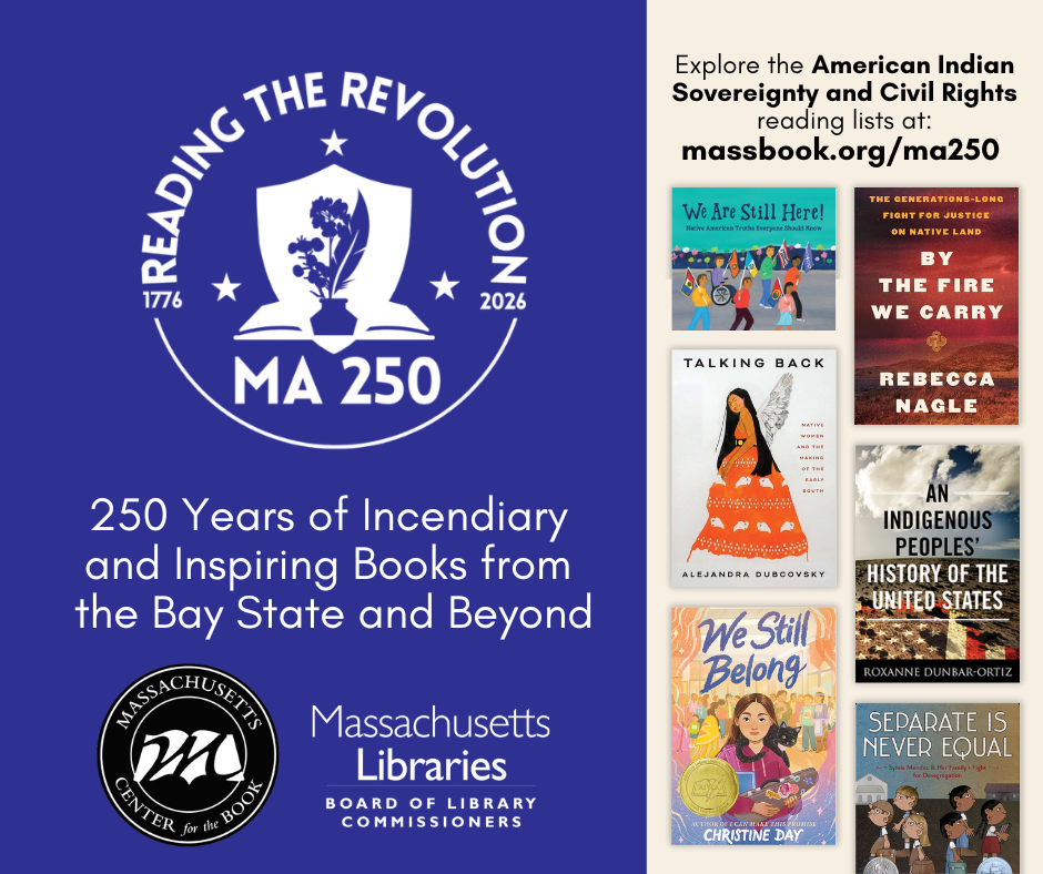 ALT text: Image promoting "MA250:Reading the Revolution" celebrating 250 years of influential books with the MA 250 logo, Massachusetts Center for the Book logo and MBLC logo. American Indian Sovereignty and Civil Rights books are featured to the right. Book covers featured include: We Are Still Here, The Fire We Carry, Talking Back, An Indigenous Peoples’ History of the United States, We Still Belong, and Separate Is Never Equal.